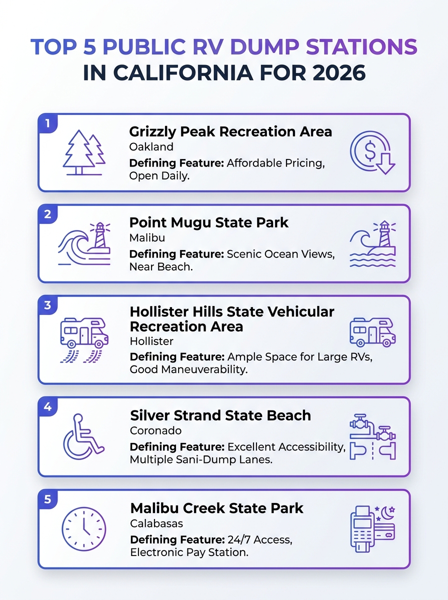 A quick visual guide to the top 5 public RV dump stations in California for 2026. Find convenient locations and key details at a glance.