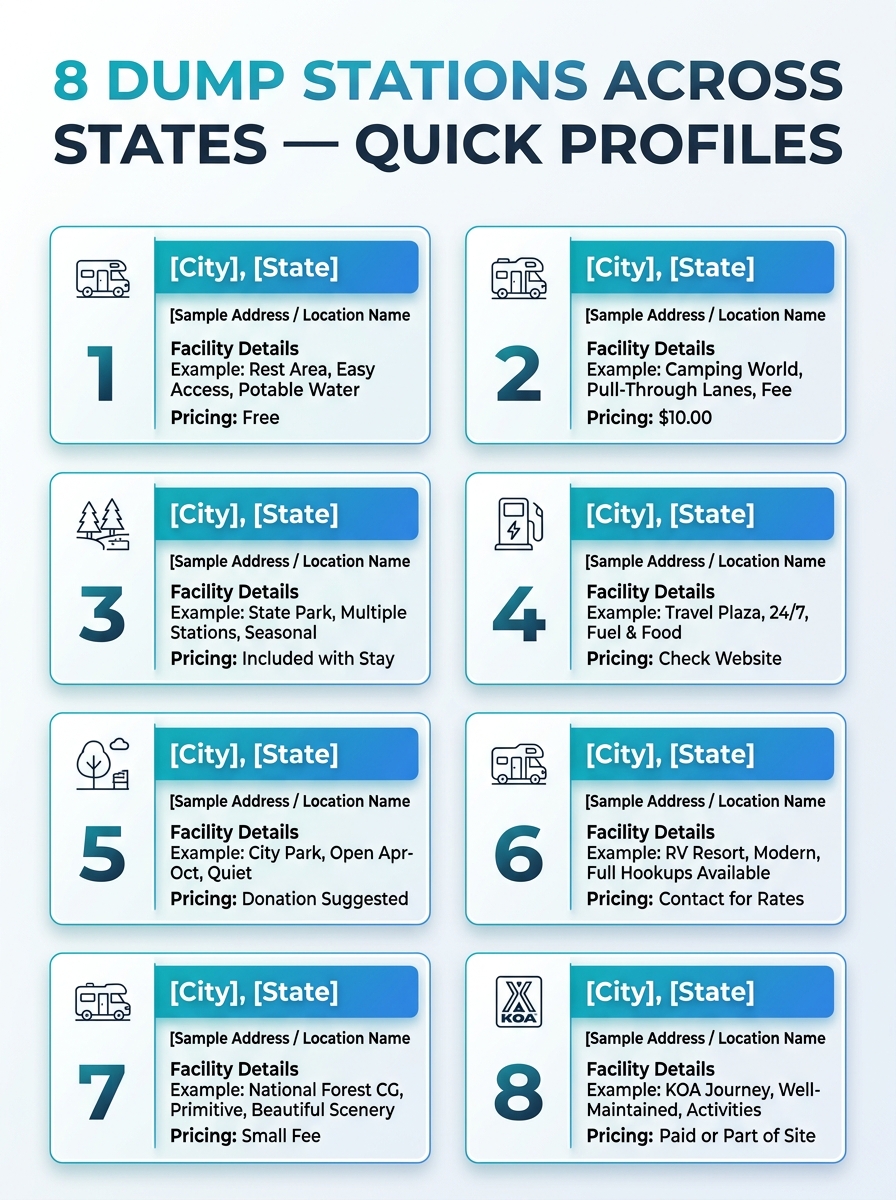 Eight state-specific dump stations profiled for quick comparison. The infographic highlights locations and key features for each site.